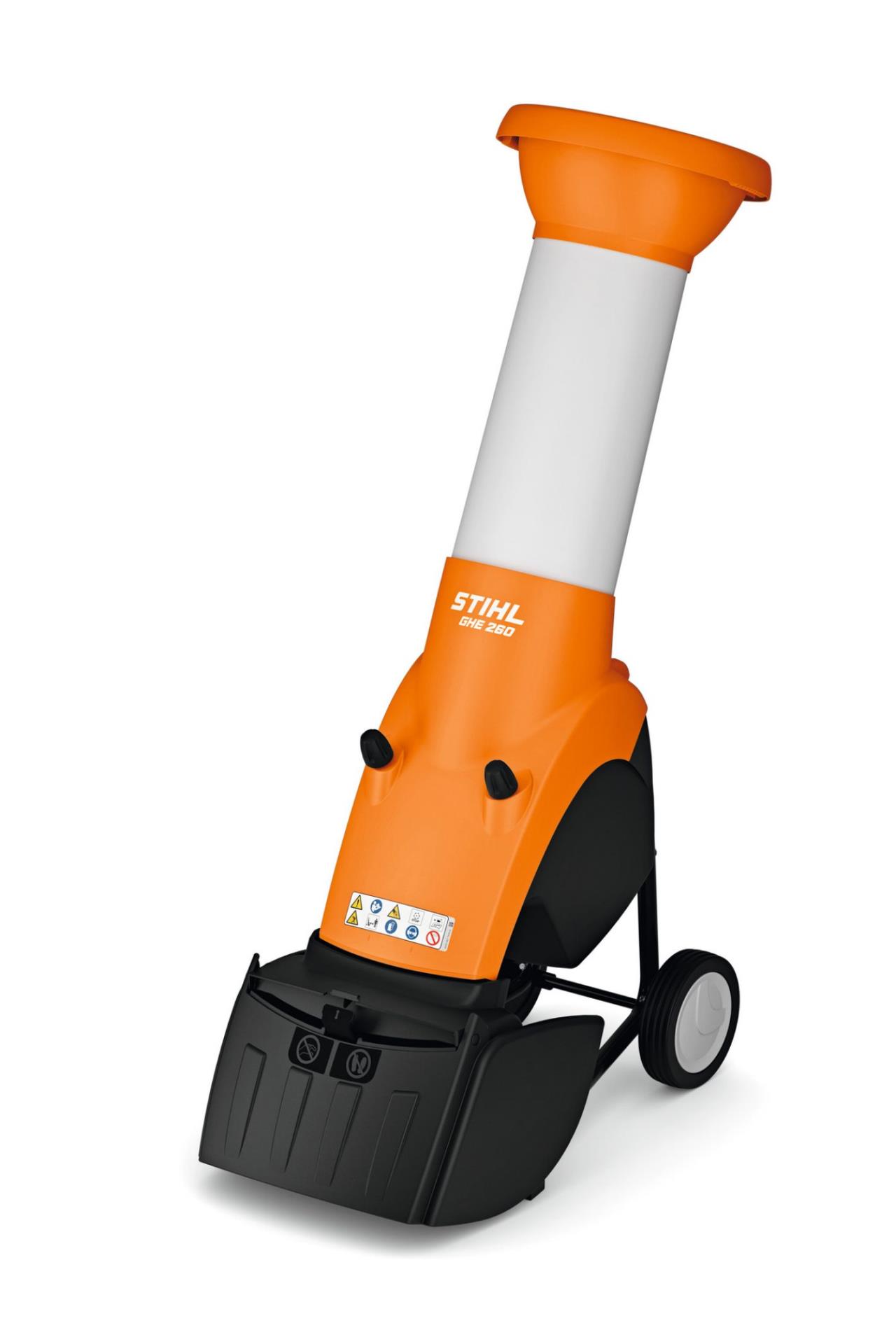 Das breite Fahrwerk unterstützt einen sicheren Stand und erleichtert den Transport des Häckslers. Um das Häckselgut direkt unter dem Elektro-Gartenhäcksler GHE 260 aufzufangen, gibt es optional den robusten 50 l Häckselbehälter STIHL AHB 050. Der elektromagnetische Sicherheitsverschluss verhindert ein automatisches Starten bei Wartungsarbeiten oder einem Messerwechsel.