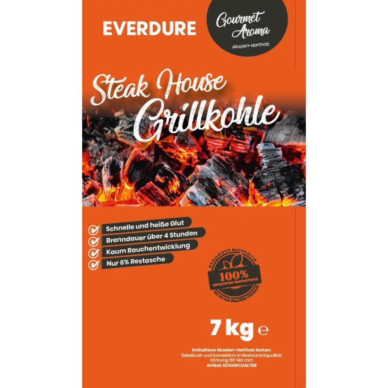 Mit der Steak House Grillkohle von Everdure treffen Sie eine ausgezeichnete Wahl in Sachen Grillbrennstoffe: Die aus den Akazien-Harthölzern Sekelbush und Kameldorn bestehende Holzkohle garantiert eine Brenndauer von über 4 Stunden und kann damit vielseitig beim Grillen eingesetzt werden. Die 100 % organischen Brennstoffe zeichnen sich durch eine schnelle und heiße Glut sowie eine nur geringe Rauchentwicklung aus. Die Grillkohle hat eine Körnung von 60 - 140 mm und besitzt Restaurantqualität.